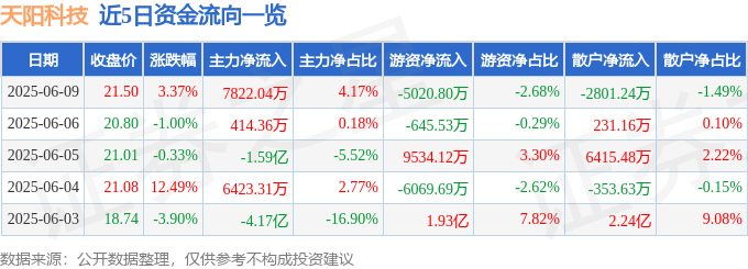 6月9日的资金流向数据方面,主力资金净流入7822.04万元,占总成交额4.17%,游资资金净流出5020.8万元,占总成交额2.68%,散户资金净流出2801.24万元,占总成交额1.49%。